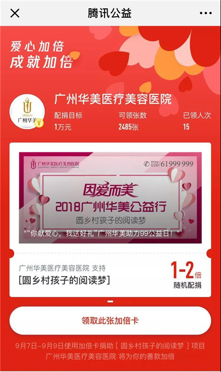 为创造良好的阅读环境,提高孩子们的文化素养,9月7-9日,广州华美将联手腾讯公益发起全民公益“99公益日”——爱心加倍·美丽增值丨圆乡村孩子的阅读梦活动,用爱心传递一份情,用阅读守护孩子们的梦想!日前,广州华美已经启动“爱心加倍·美丽增值丨圆乡村孩子的读书梦”项目爱心捐款通道——爱心加倍卡,9月7日-9日使用爱心加倍卡捐助,广州华美将为您的善款加倍。