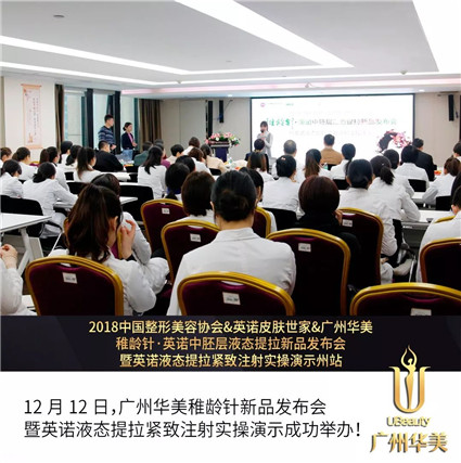 为积极响应【中国整形美容协会培训部——关于举办“皮肤美容技术系列公益培训班”】的号召,12月12日,广州华美携手英诺皮肤世家成功举办的【广州华美稚龄针新品发布会暨英诺液态提拉紧致注射实操演示】!面部年轻化医师到场见证华美抗衰美塑新品【稚龄针】发布,并与广州华美美容皮肤医师团共同探讨医疗美容技术的发展和临床应用。
